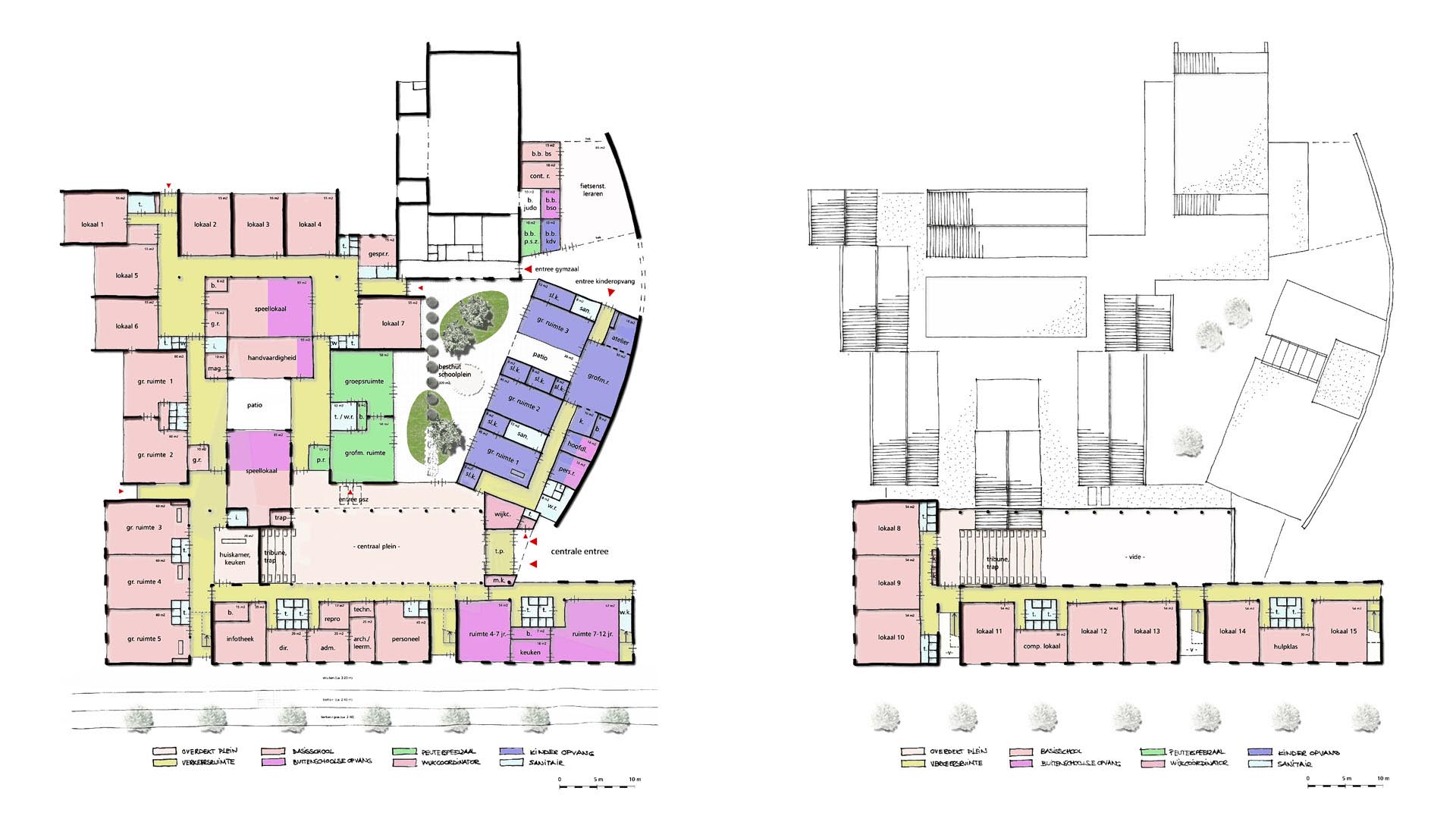 The community school “Het Palet” (The Palette) accommodates all school and childcare facilities from 0 to 12 and thereby functions as a centre in the district. Meeting and collaborating were the themes on which the design has been based. The added value of a multifunctional accommodation is only evident when people really meet. By adding a central hall at the school and so connecting all facilities, meeting is facilitated the best. A two-level new building forms a transition between the small-scale low-rise building on the one side and the relative large scale on the other side of the location. In this way a void has not only been filled programmatically, but in an urban way as well.