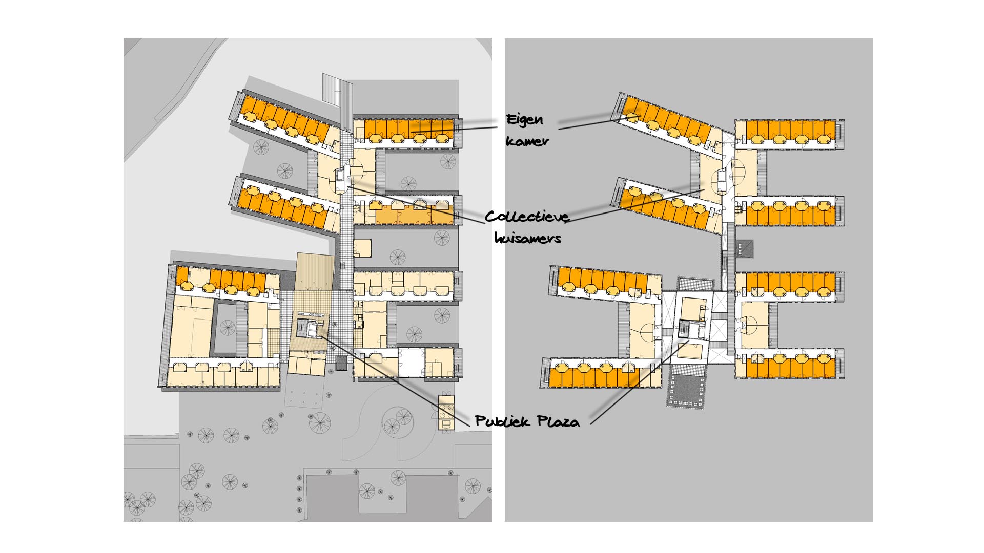 De indeling van de appartementen, die zijn geclusterd in groepen van 8 cliënten, biedt de mogelijkheid om de zorg op een hotelachtige wijze te organiseren. Per laag kunnen de 4 groepen worden gemengd, zodat mensen met dezelfde manier van leven elkaar kunnen vinden. De positionering van de woonkamers ondersteunen deze vrijheid van het leven en het zelfstandig maken van keuzes. In zowel huidige als toekomstige situaties met meer individueel ingestelde mensen is dit een zeer belangrijke mogelijkheid.